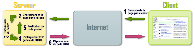 On écrit du tout d’abord code php dans une page html. Lorsque le navigateur va voir du code php celui-ci sera envoyé et traité par le serveur MySQL qui va alors envoyer une requête à la base de donnée par le biais du langage SQL2).
